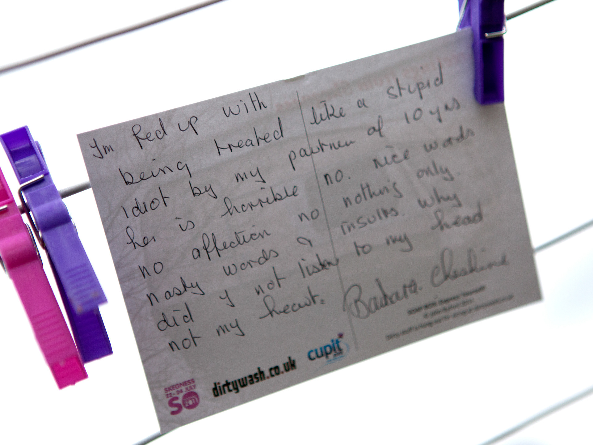 Back in 2011, award-winning photographer John Byford gave SO Festival a good shake and tumble with Dirty Wash, his mischievous installation starring a bright red washing machine. Visitors were invited to “air their dirty laundry” by scribbling their secrets, cheeky confessions and half-blushed thoughts onto postcards before pegging them onto a giant washing line for everyone to have a nose at.